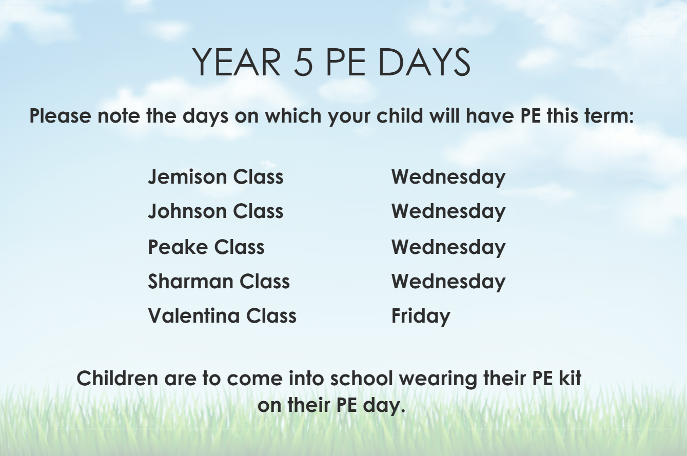 Year 5 will have their homework given out on a Friday to be handed in and completed by the next Friday.